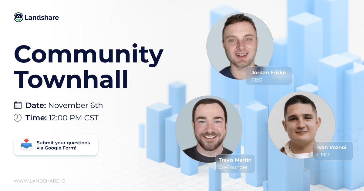 Join Jordan (CEO), Travis (Co-Founder), and Ivan (CMO) as they discuss everything happening with Landshare v2, recent DAO proposals, and take your questions live.